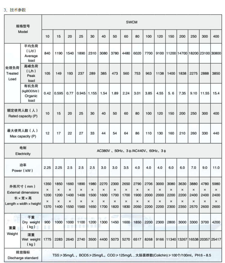 | 重量(濕重): | 13267kg | 排放指標: | TSS≯35mg/L,BOD5≯25mg/L,COD≯125mg/L,大腸菌群數(Colichin)≯100個/100ml,PH-6~8.5 |