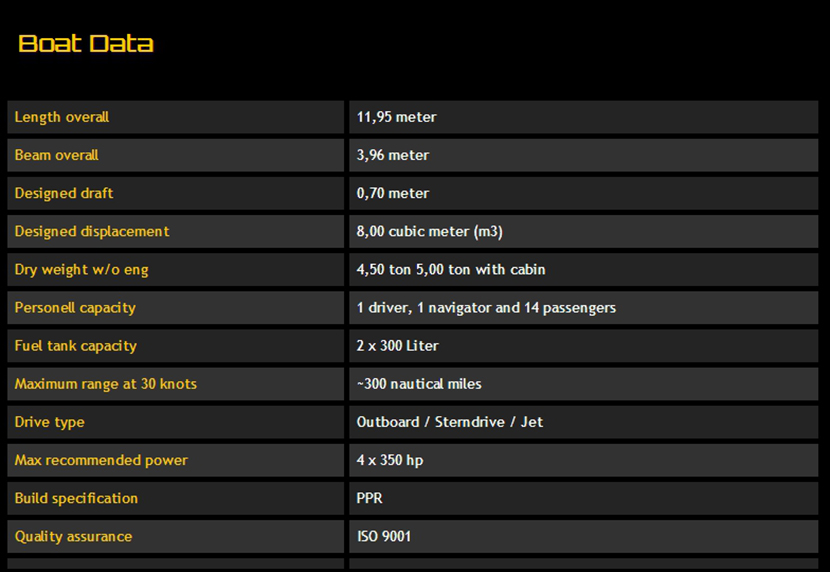 | 燃油容量: | 2x300L | 船組人員: | 2 |
