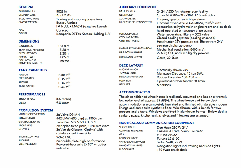 | 發(fā)動機品牌: | Volvo D9 MH | 齒輪箱: | 2×Twin Disc MG5091 |