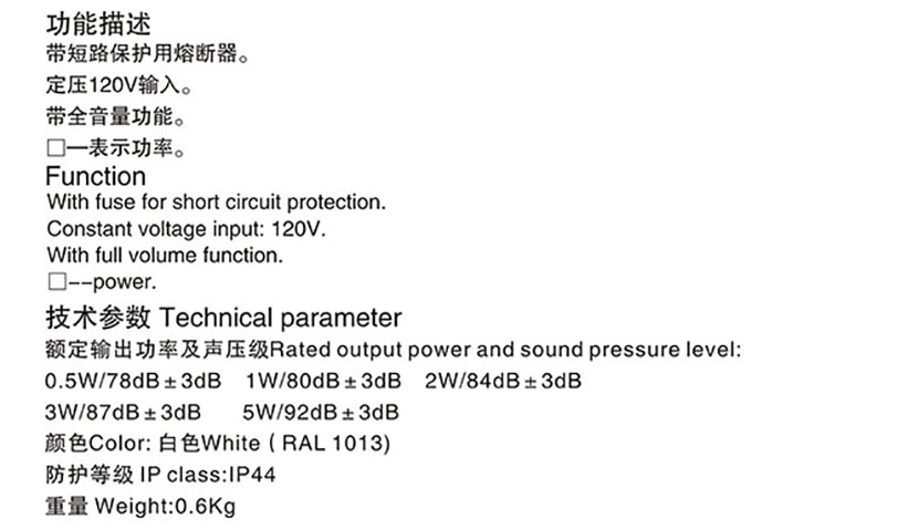 | 功率: | 0.5W | 聲壓等級: | 78dB |