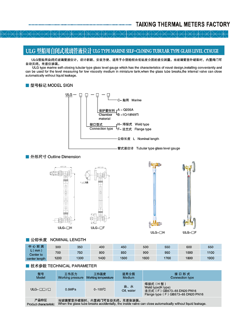 | ULG型船用自閉式玻璃管液位計 | |||