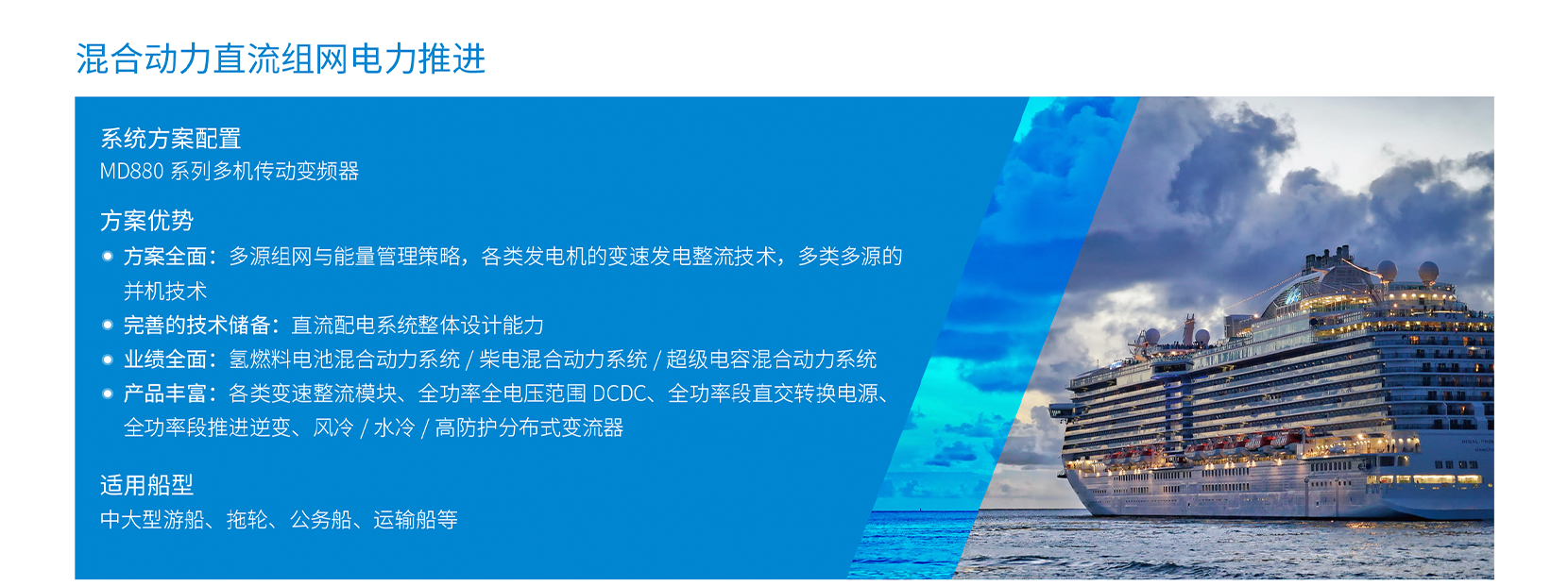 | 適用船型: | 中大型游船;拖輪;公務(wù)船;運輸船等 | 方案優(yōu)勢: | 方案全面,各類發(fā)電機的變速發(fā)電整流技術(shù);多類多源的,并機技術(shù);直流配電系統(tǒng)整體設(shè)計能力業(yè)績案例全面,涵蓋氫燃料電池類/柴電類 / 超級電容類;產(chǎn)品豐富 |